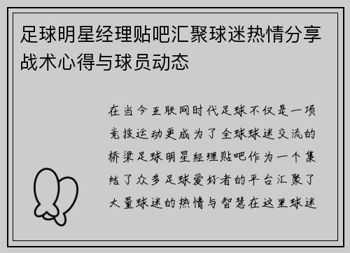 本文旨在探讨哪位足球明星对罗斯德情有独钟,深入解析他的喜爱原因与影响。罗斯德作为一名杰出的足球运动员,在技术和战术意识方面都表现出色,吸引了许多球迷和专业人士的关注。在众多足球明星中,有一位特别的球员对罗斯德的表现给予了高度评价,并在多个场合表达了自己的支持与喜爱。通过分析这位足球明星对罗斯德的喜爱原因,以及这种喜爱带来的积极影响,本文将从个人成就、竞技风格、职业精神和社会影响四个方面进行详细阐述...